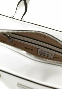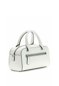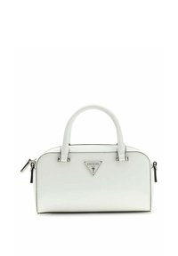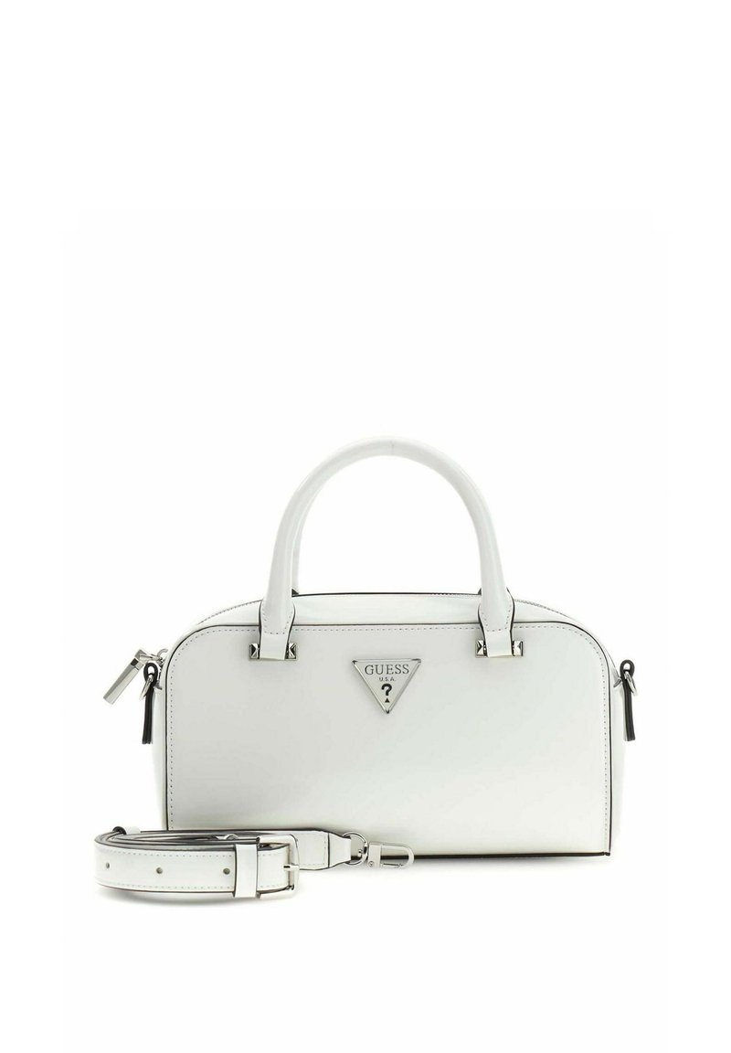 Sac à main Guess en cuir blanc avec deux poignées, bandoulière amovible, fermeture éclair, et une plaque logo en métal à l'avant.