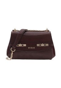 Sac à main en cuir noir effet crocodile avec une bandoulière en chaîne argentée, forme rectangulaire, fermoir avant avec logo de la marque et surface texturée.