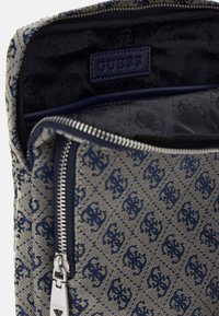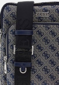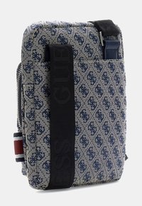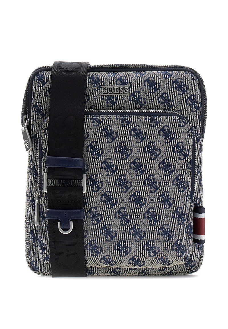 Sac bandoulière carré en tissu à motifs bleus, poche zippée devant, logo Guess, large bandoulière noire et détail de bande latérale rouge-blanc-bleu.