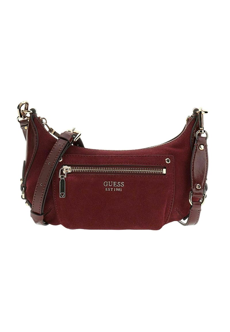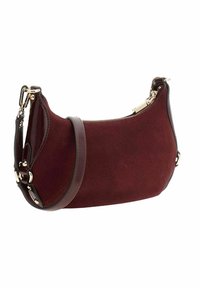 Sac bandoulière en daim bordeaux avec ferrures dorées, sangle en cuir réglable, poche zippée à l'avant et logo embossé. Design compact et arrondi.