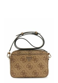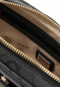 Sac bandoulière noir Guess avec motif logo répété, garniture couleur or et bandoulière réglable.