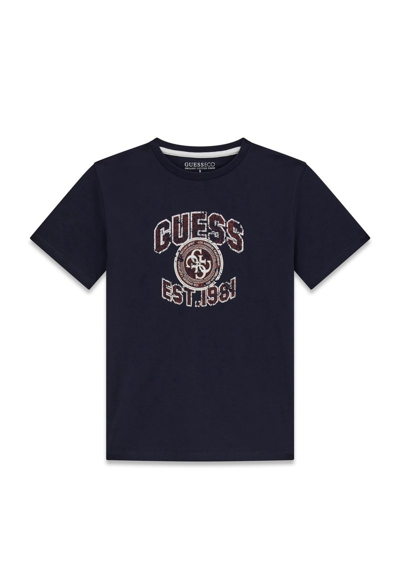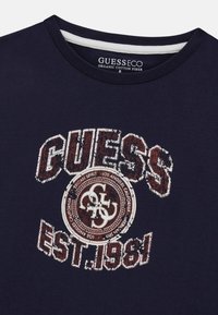 T-shirt à manches courtes bleu marine foncé avec le texte « GUESS EST. 1981 » et un logo circulaire en blanc usé et marron au centre devant.