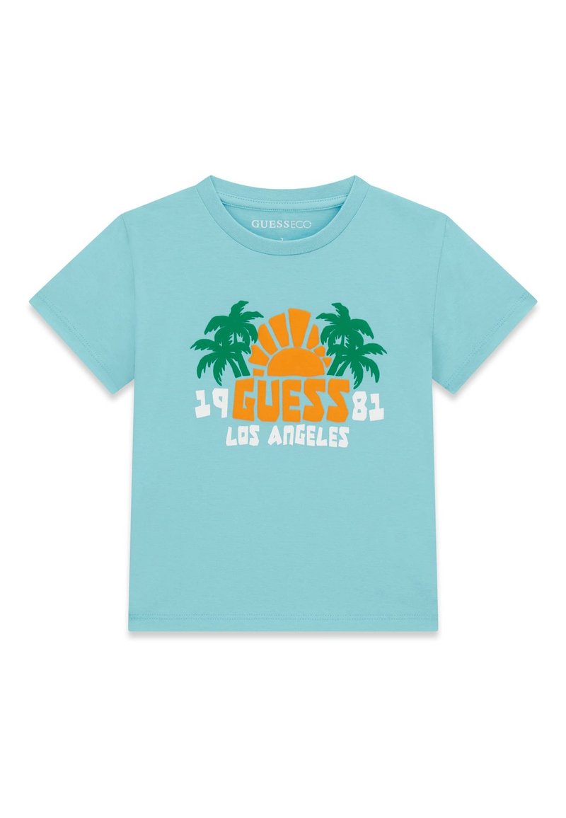 Chemise bleu clair à manches courtes avec un soleil orange, des palmiers verts et le texte « 1981 GUESS LOS ANGELES » sur le devant.