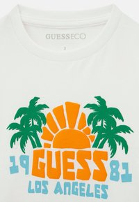 T-shirt blanc à manches courtes avec des palmiers verts, un soleil orange et un texte bleu "1981 GUESS LOS ANGELES" sur le devant.
