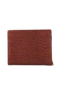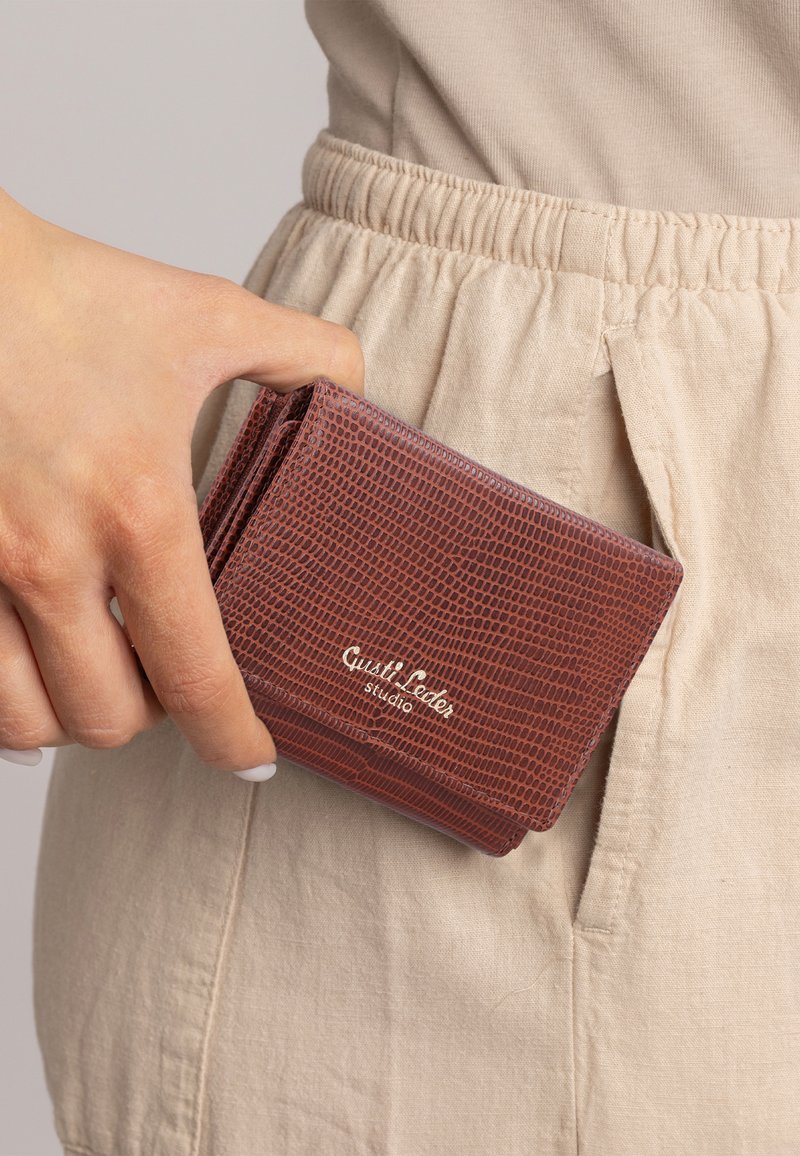 Portefeuille en cuir brun texturé avec un design pliable, arborant un branding discret. Tenue dans une main sur un tissu beige clair.