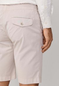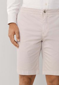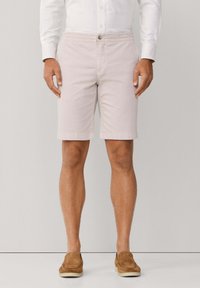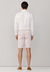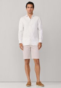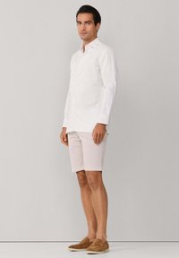 Homme portant un short beige clair sur mesure, une chemise blanche boutonnée et des chaussures marron en daim sans lacets, debout devant un fond uni.