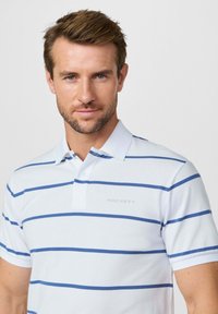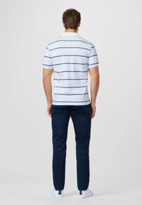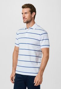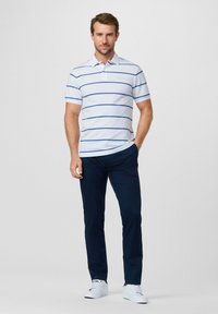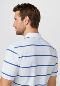 Homme portant un polo blanc à rayures horizontales bleues et un pantalon foncé, regardant légèrement vers la droite sur un fond uni.