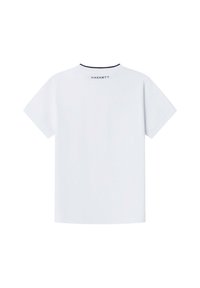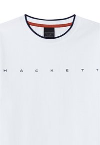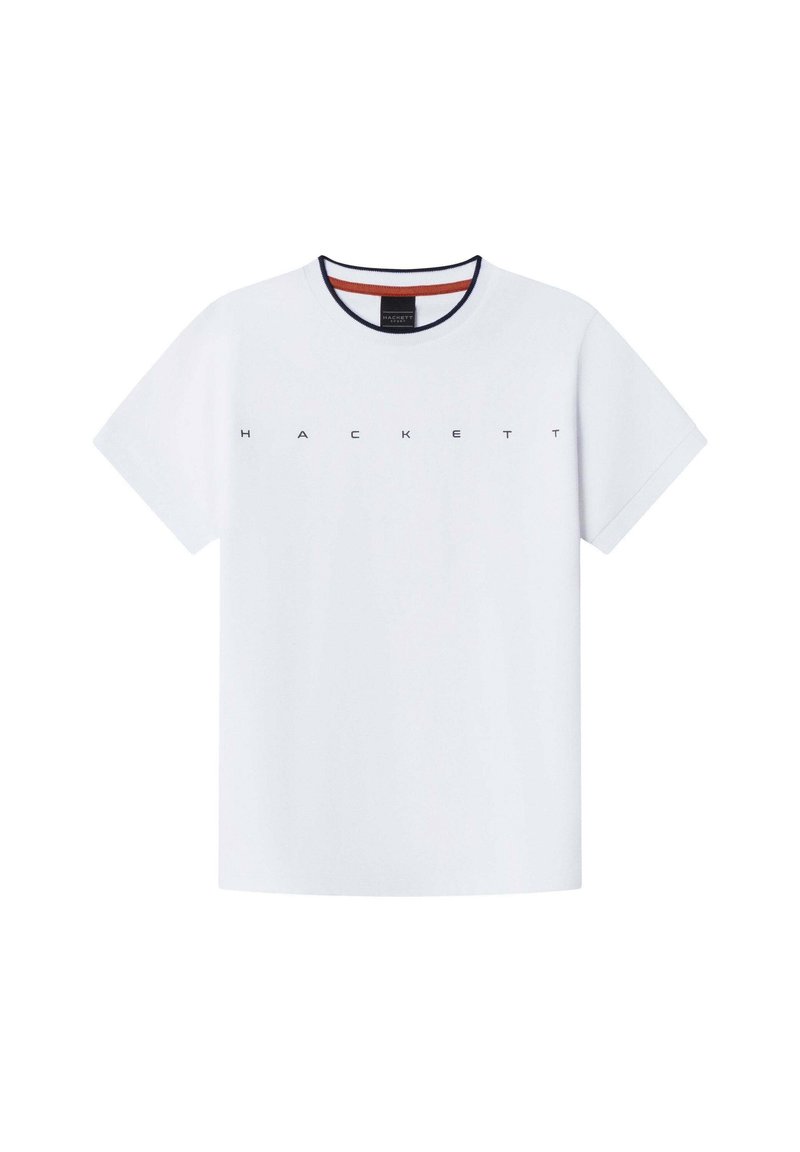 T-shirt en coton blanc à manches courtes, col rond, accents bleu marine et rouge sur le col, avec "HACKETT" imprimé en bleu marine sur la poitrine.