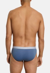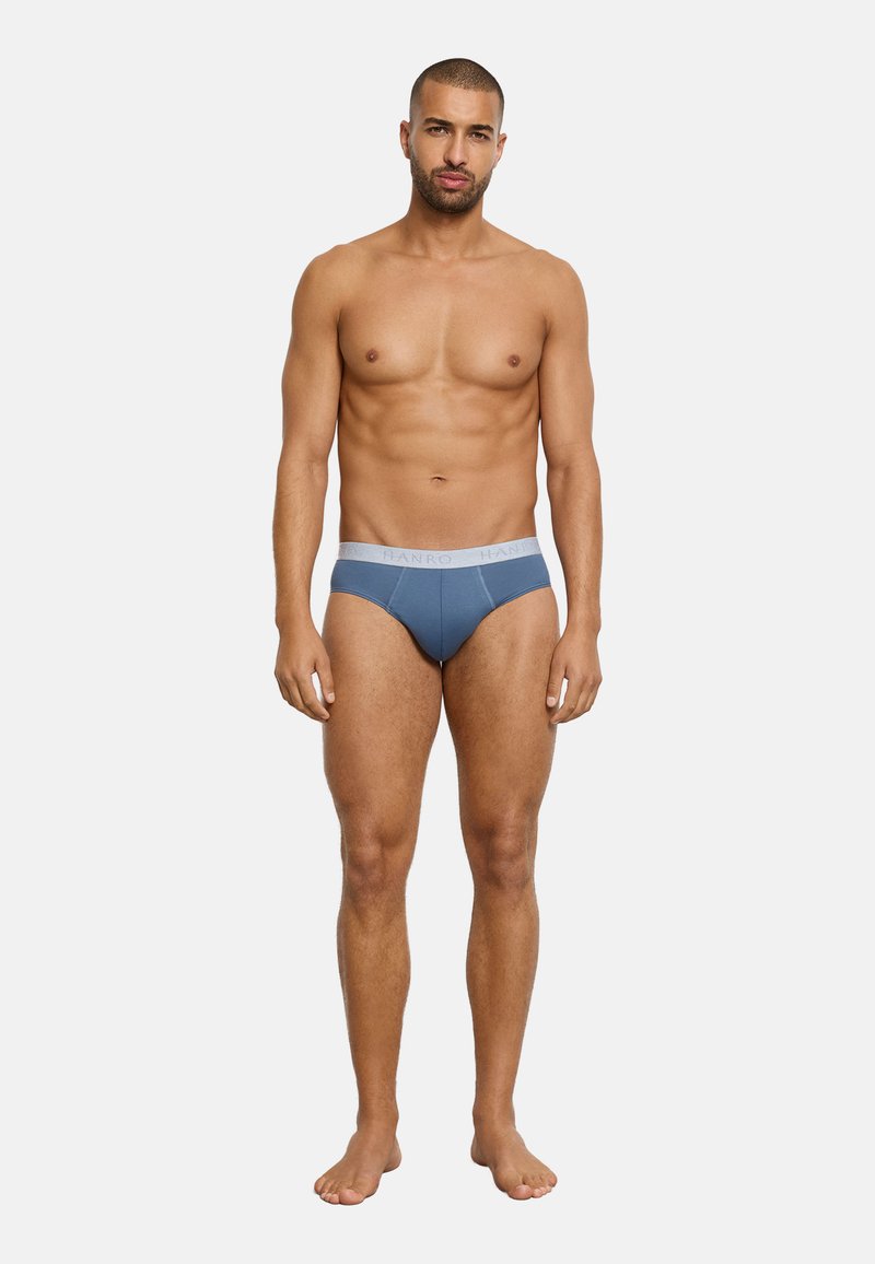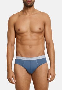 Homme debout pieds nus devant un fond uni, portant un slip bleu avec une ceinture taille gris clair, face à l'avant avec une expression neutre.