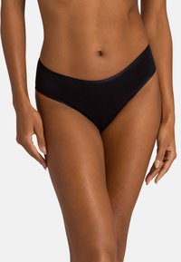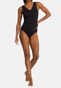 Femme debout pieds nus portant un haut noir sans manches et une culotte noire assortie devant un fond clair uni.