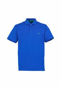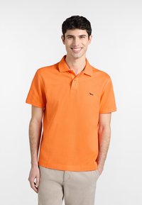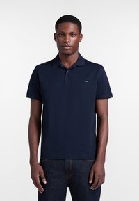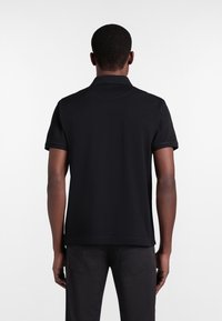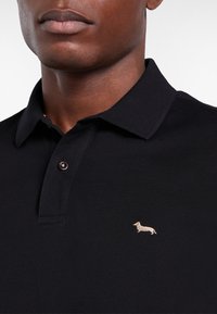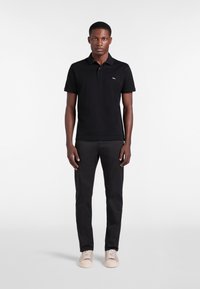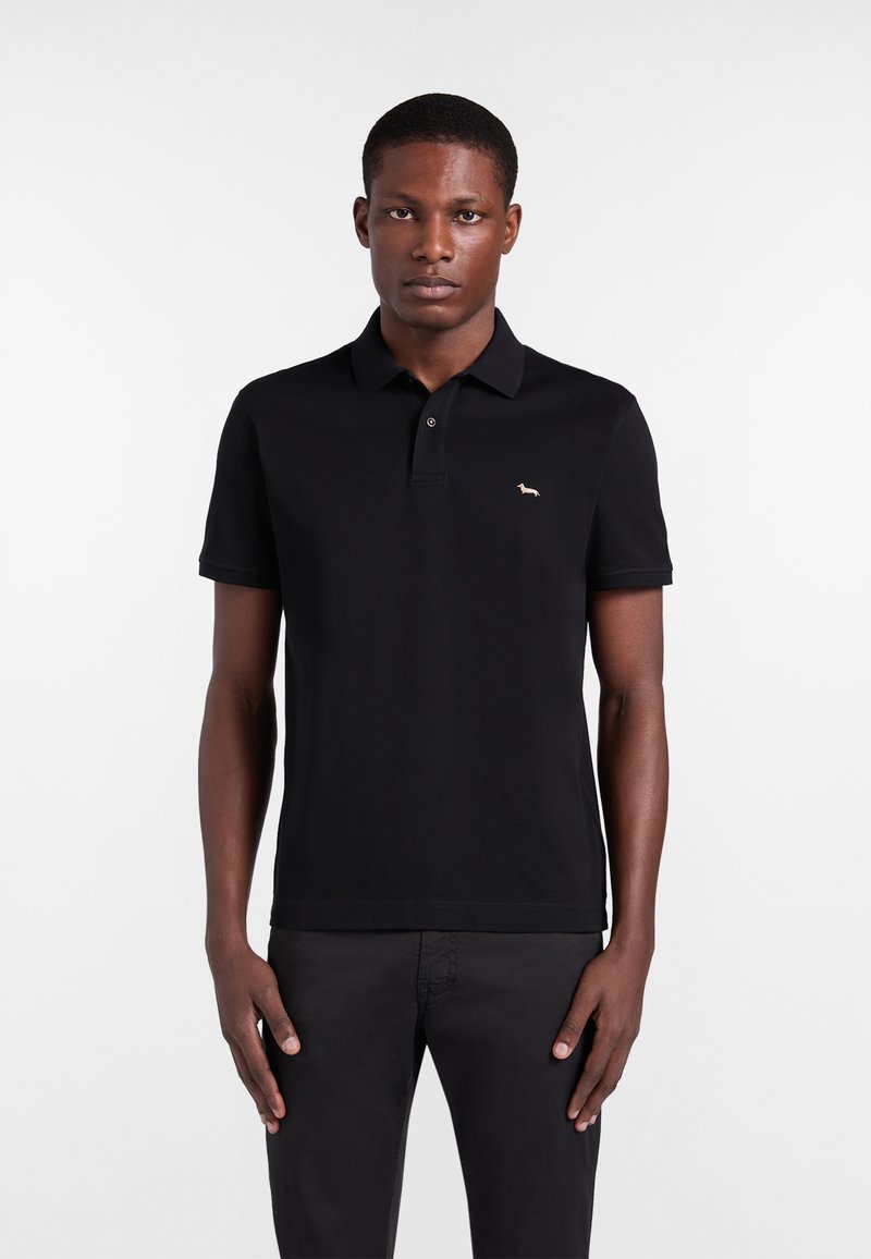 Homme portant un polo noir à manches courtes avec un petit logo de chien sur la poitrine gauche, assorti à un pantalon noir, debout devant un fond blanc.
