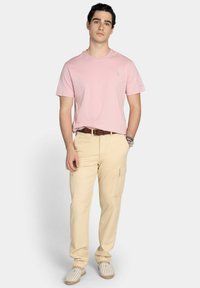 Jeune homme portant un t-shirt rose pâle, un pantalon beige, une ceinture marron et une montre-bracelet sur un fond clair neutre.