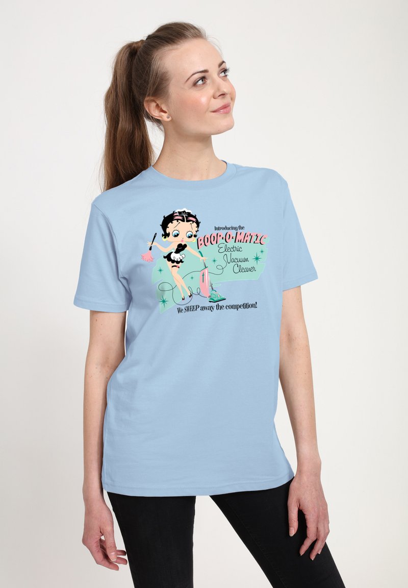 Femme portant une chemise bleu clair avec un dessin animé de Betty Boop en train de passer l'aspirateur, accompagnée d'un texte faisant la promotion de "Boop-O-Matic Aspirateur Électrique".