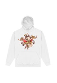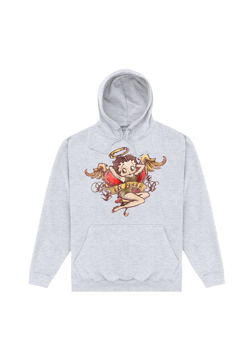 Sweat à capuche gris clair avec poche avant, arborant un ange en dessin animé aux ailes dorées, un halo, un haut rouge, et une bannière portant l'inscription "Petit Ange".