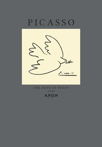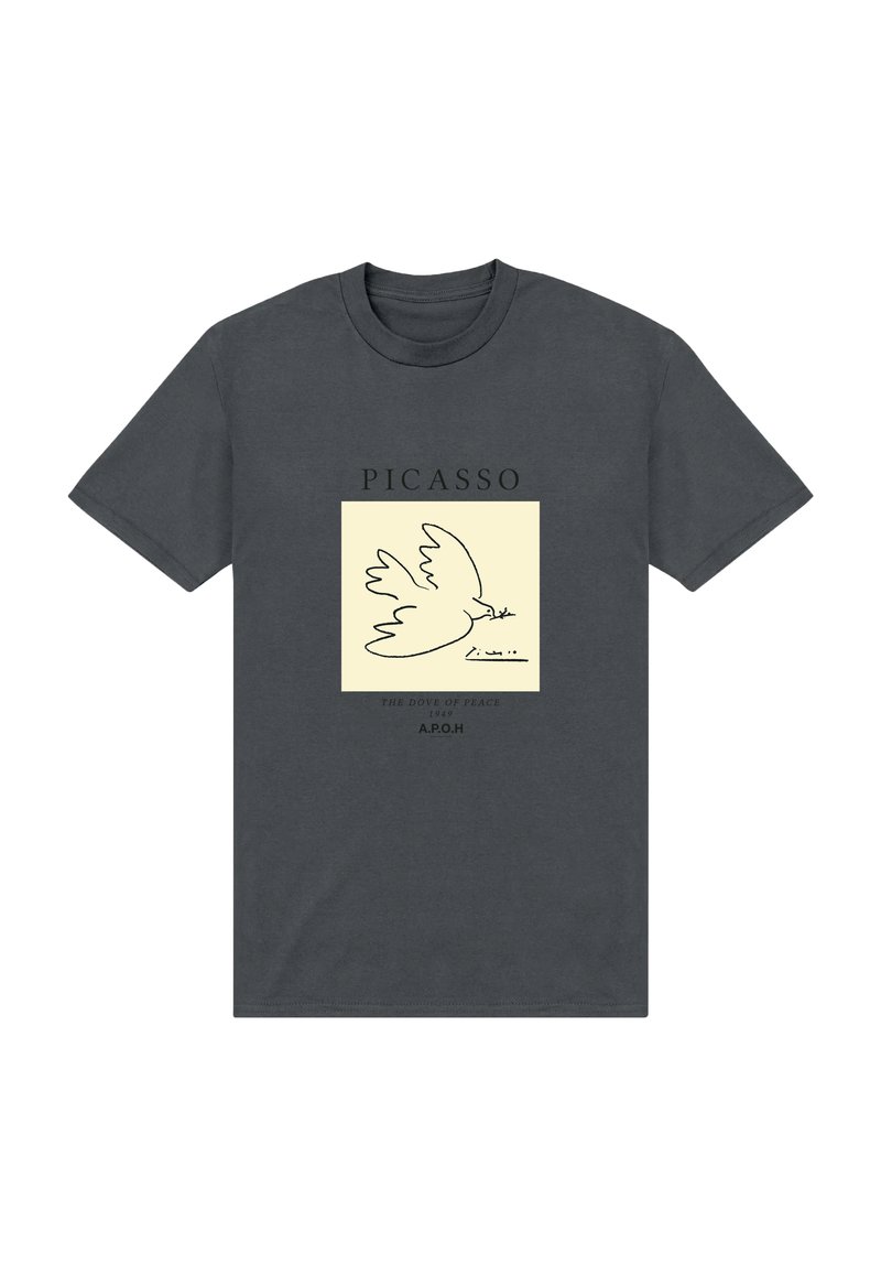 T-shirt gris foncé avec un dessin minimaliste d'une colombe dans le style de Picasso tenant une branche d'olivier et le texte : "PICASSO" et "LA COLOMBE DE LA PAIX 1949 A.P.O.H".