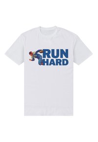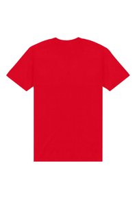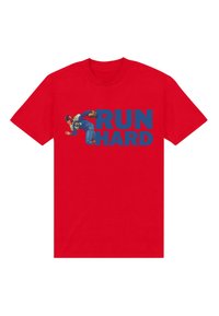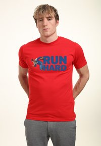 Jeune homme portant un t-shirt rouge avec un motif de joueur de football et le texte "COURIR FORT", debout les mains dans les poches.