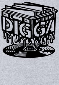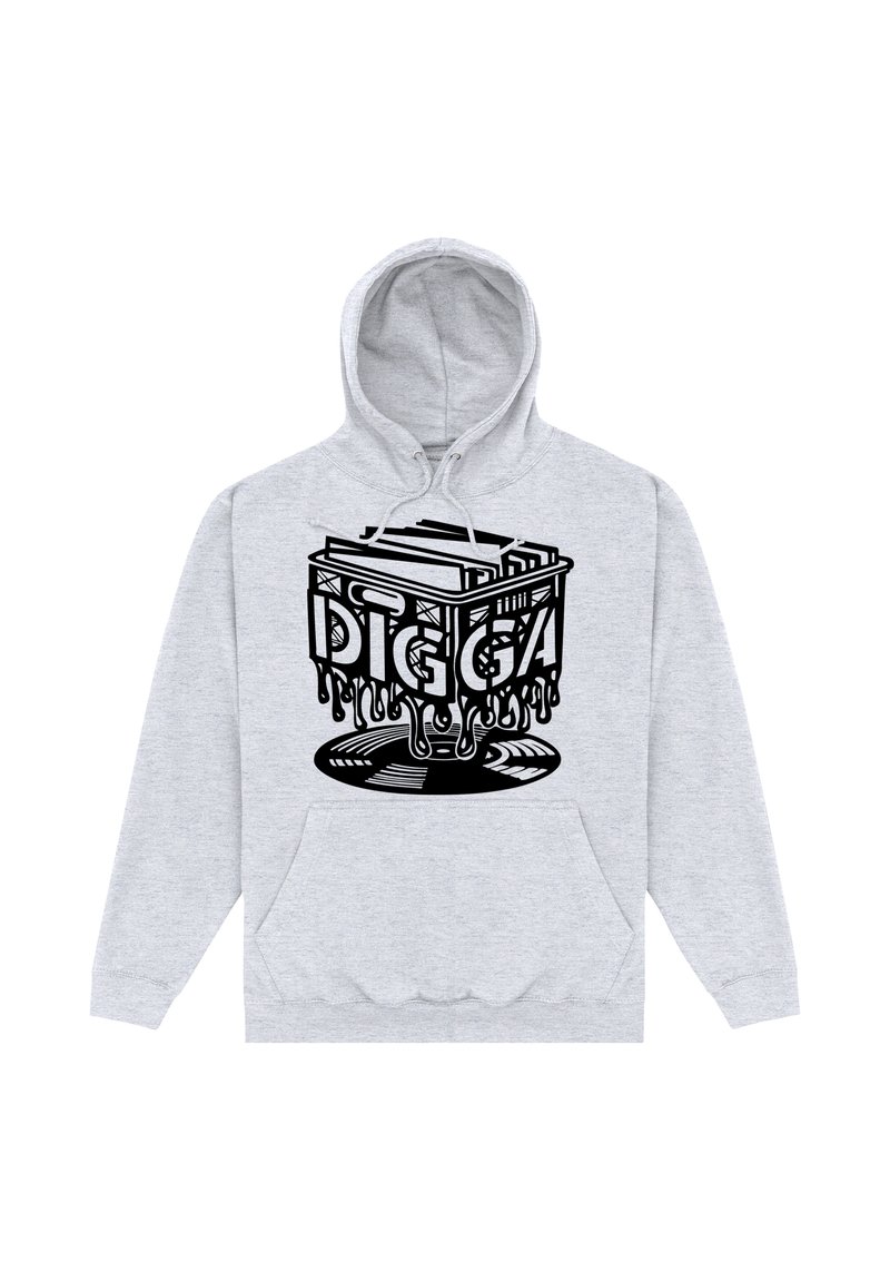 Sweat à capuche gris clair avec un graphisme noir d'une caisse fondante tenant des disques vinyles et le mot « DIGGA » au-dessus d'un disque vinyle en bas.