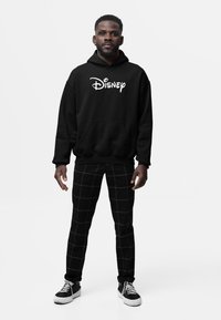 Homme portant un sweat à capuche Disney noir et un pantalon noir avec des lignes de grille blanches, debout avec une main dans la poche sur un fond uni.