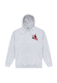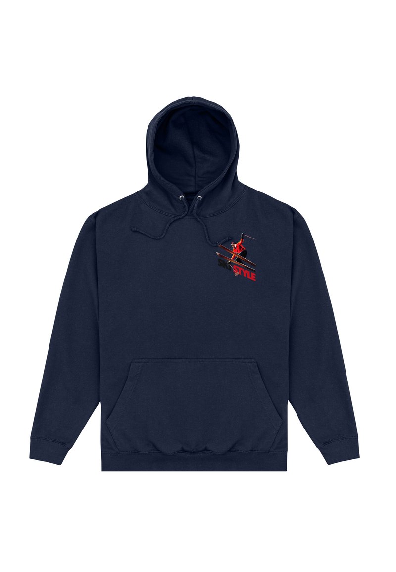 Sweat à capuche bleu marine avec poche avant et cordon de serrage, ornée d'un petit graphique d'un skieur en veste rouge et skis noirs au-dessus du mot "STYLE" sur la poitrine.