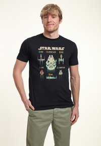 Jeune homme portant un t-shirt noir Star Wars avec des illustrations légendées du Faucon Millenium, du X-Wing, du Y-Wing, de l'A-Wing, du B-Wing et du Snowspeeder 47.