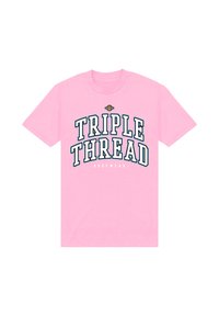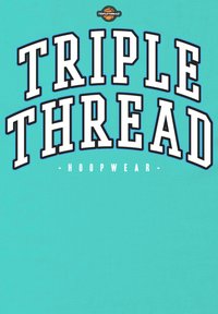 T-shirt turquoise à manches courtes avec l'inscription "TRIPLE THREAD" en lettres blanches grasses bordées de noir, et un petit texte "HOOPWEAR" en dessous.