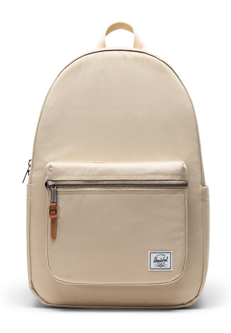 Sac à dos beige Herschel avec poche avant à fermeture éclair et tirette en cuir, étiquette de marque blanche rectangulaire, et poignée de transport supérieure.
