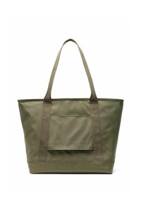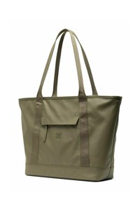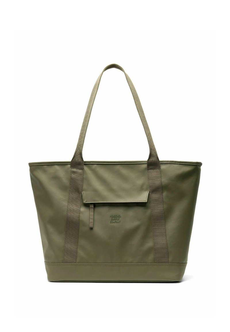 Sac fourre-tout vert olive avec longues anses, poche avant à rabat et logo embossé "Herschel Supply Company".