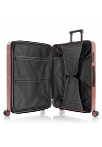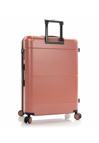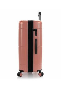 Valise rigide couleur or rose avec quatre roues pivotantes et une poignée télescopique noire, nom de la marque "HEYS" embossé à l'avant.