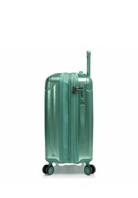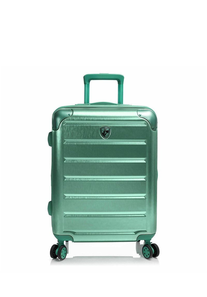 Valise rigide de taille moyenne, métallique verte, avec poignée télescopique et quatre roues multidirectionnelles, debout sur fond blanc.