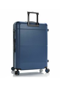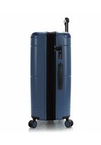 Valise rigide bleu marine avec quatre roues pivotantes et une poignée télescopique, nom de marque "HEYS" en relief à l'avant.