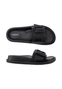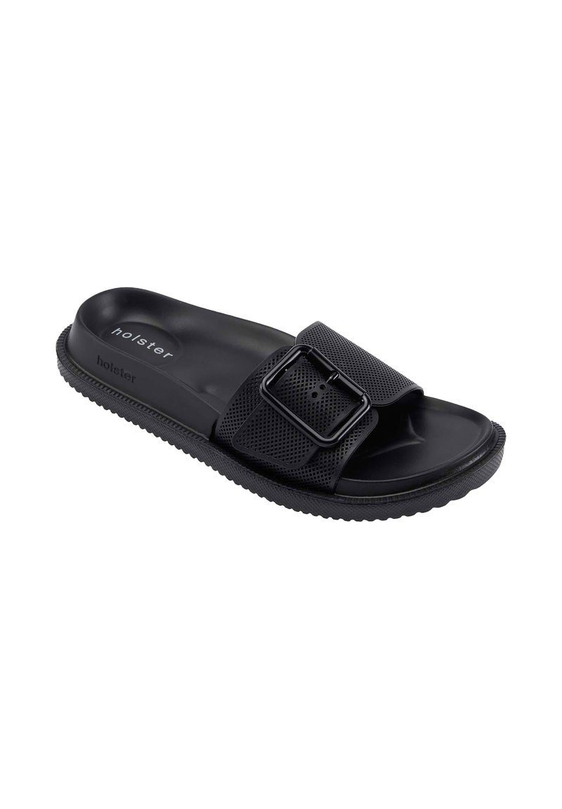 Sandale à glissière noire avec semelle texturée, bride perforée et grande boucle réglable, marquée "holster" sur la semelle et le côté.