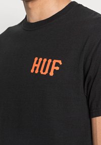 T-shirt noir en coton à manches courtes et col rond. Présente un logo orange "HUF" sur la poitrine gauche. Texture lisse, coupe décontractée.