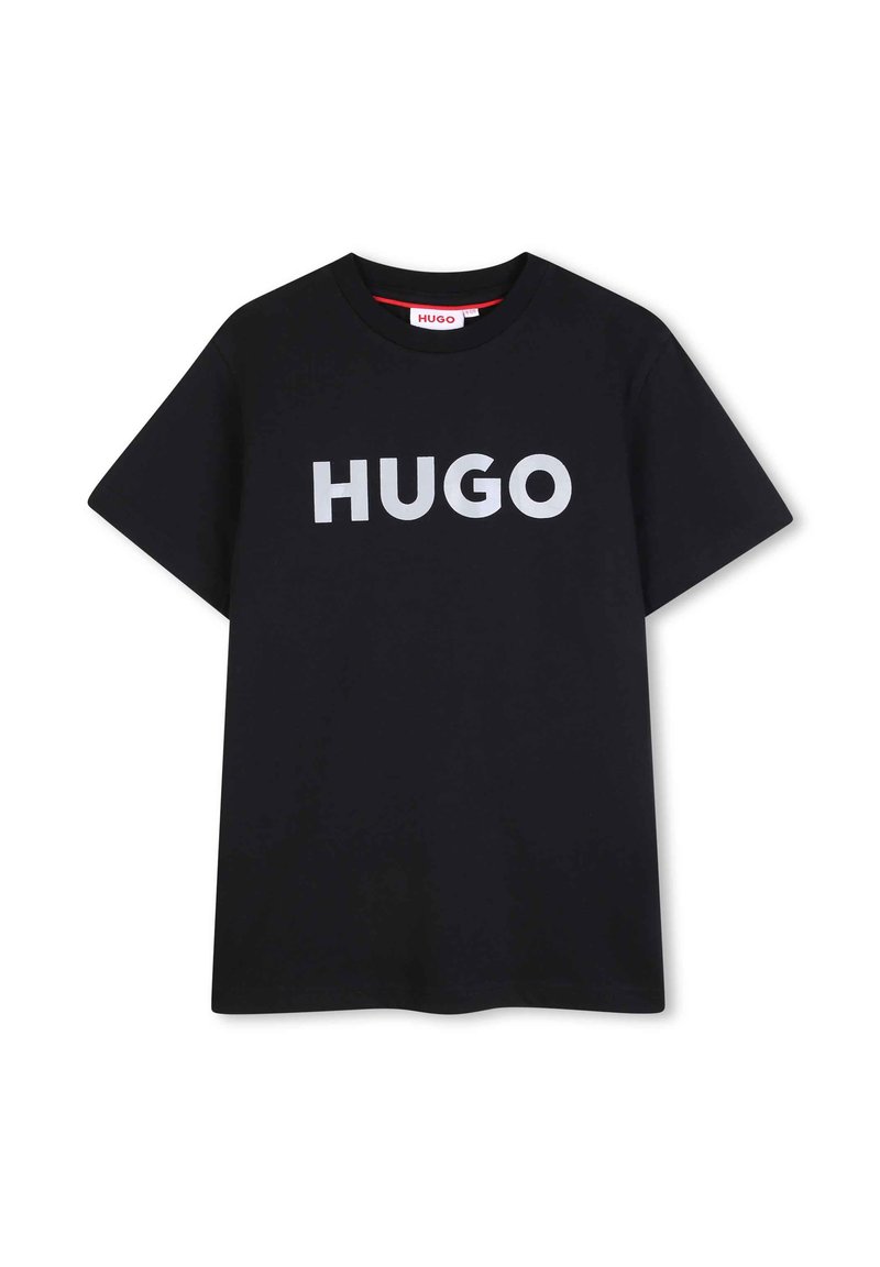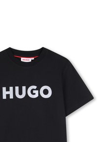T-shirt noir à manches courtes avec le texte blanc "HUGO" centré sur la poitrine, col rond, présenté sur un fond blanc.
