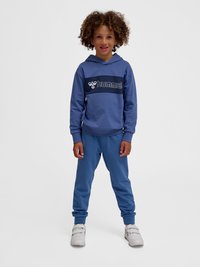 Enfant aux cheveux bouclés portant un sweat à capuche bleu hummel et un pantalon de jogging bleu, debout et souriant sur un fond clair uni.