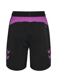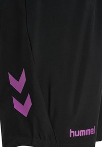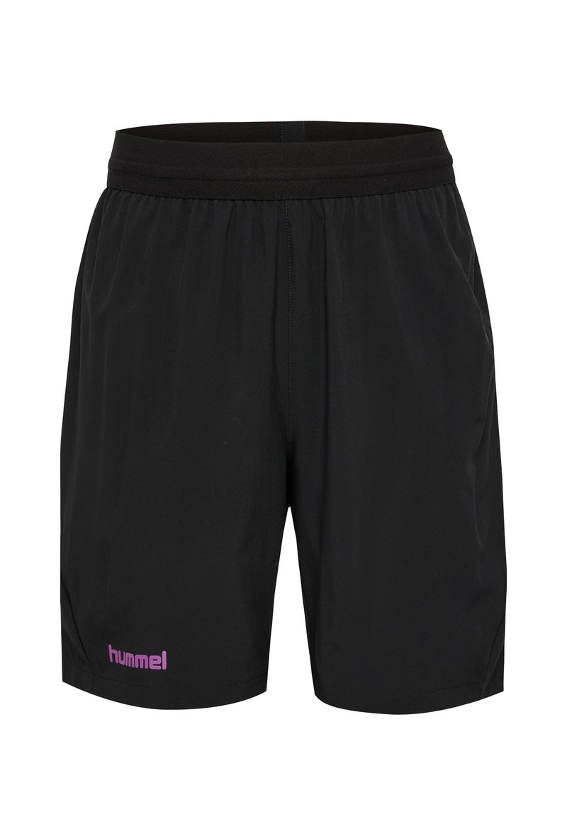Shorts de sport noirs avec taille élastique et logo rose "hummel" sur la jambe inférieure gauche, présentés sur un fond blanc.