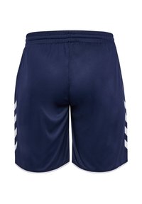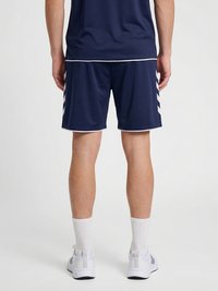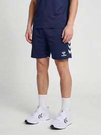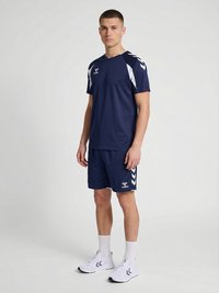 Homme portant un short de sport hummel bleu marine, des chaussettes blanches et des chaussures de sport blanches sur un fond clair uni.