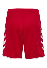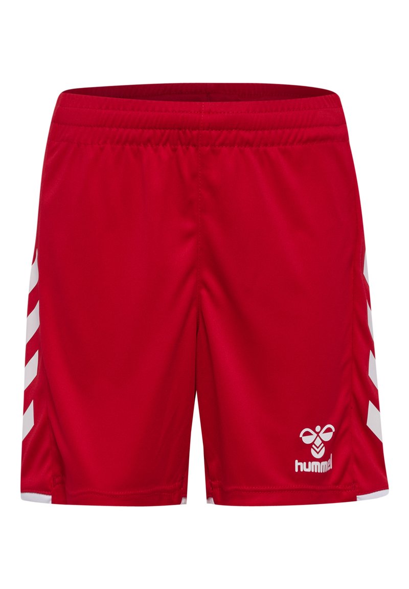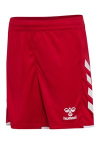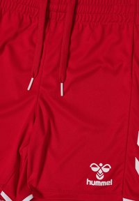 Shorts de sport rouges avec des bandes blanches en chevron sur les côtés et un petit logo blanc Hummel sur la partie inférieure de la jambe droite.