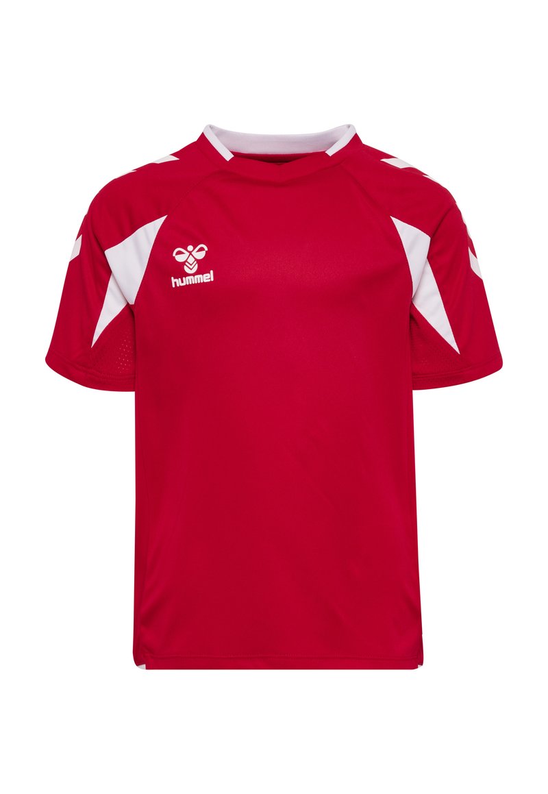 Maillot de sport rouge à manches courtes avec des accents en chevron blancs sur les épaules et les côtés, arborant un logo Hummel blanc sur la poitrine.