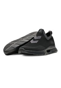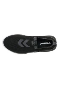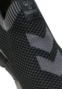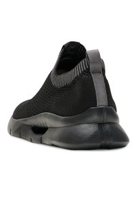 Chaussures de sport noires avec un dessus en tricot respirant, un design à enfiler élastique et un col rembourré ; elles présentent une semelle texturée et des accents gris.