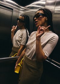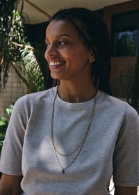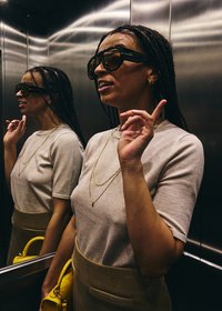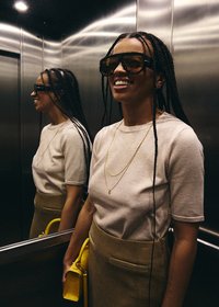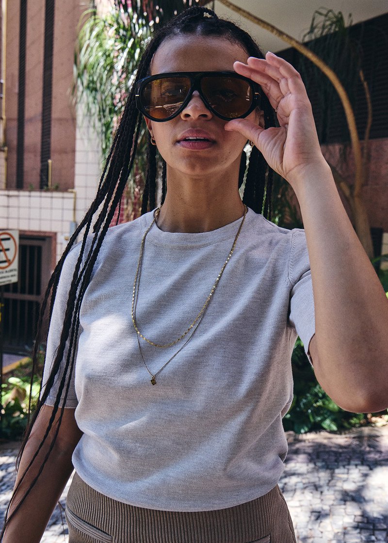 Jeune femme aux longues tresses ajustant de grandes lunettes de soleil noires, portant une chemise gris clair et des colliers en or, debout en plein air sous le soleil.