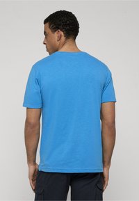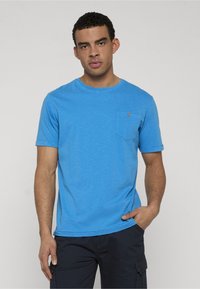 Homme aux cheveux courts bouclés portant une chemise à manches courtes bleu vif et un pantalon cargo foncé, debout avec une main dans la poche.