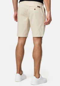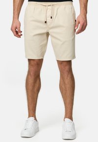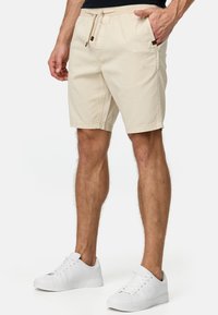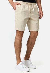 Homme portant un short beige à cordon et des baskets blanches, debout devant un fond clair uni.