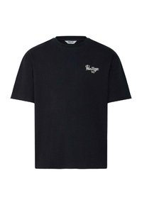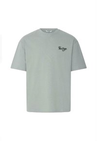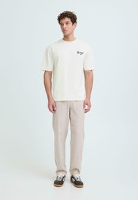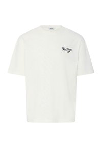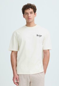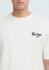 Homme aux cheveux bouclés portant un t-shirt écru avec un texte noir "Heritage Union of '63 & Old School Team Project Inc." au dos, debout devant un fond pâle.