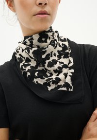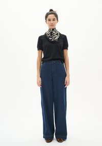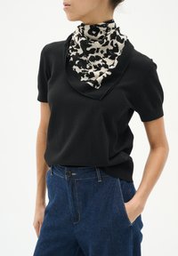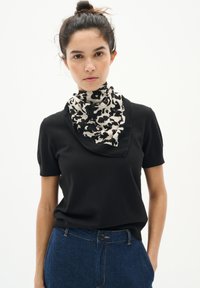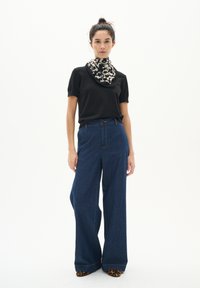 Femme debout portant un haut noir à manches courtes, un foulard à imprimé animalier autour du cou, un jean large bleu et des chaussures à imprimé léopard sur fond blanc.