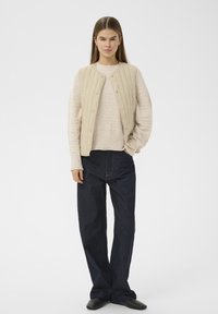 Jeune femme portant un gilet matelassé beige sur un pull crème texturé et un jean bleu foncé, debout les mains dans les poches devant un fond blanc.