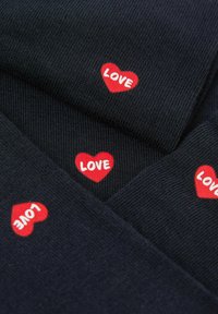 Jambes portant des chaussettes bleu marine montant jusqu'aux genoux, ornées de petits cœurs rouges contenant le mot "LOVE", sur un fond gris clair.