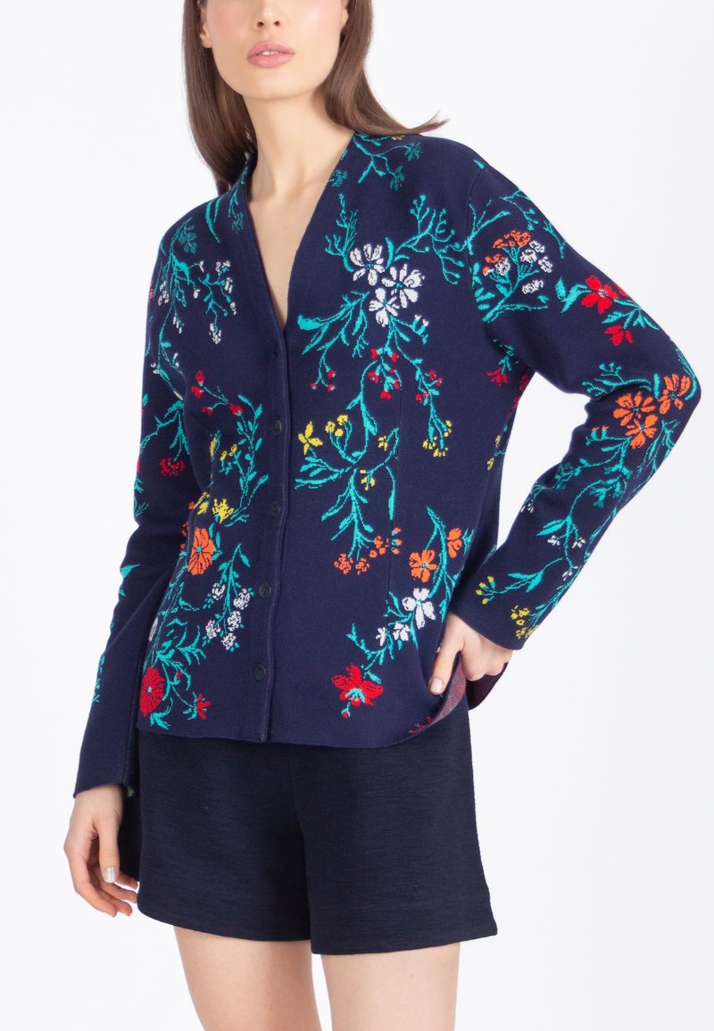 Femme portant un cardigan bleu marine boutonné avec une broderie florale multicolore et un short foncé, posant avec une main sur la hanche.