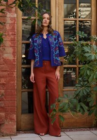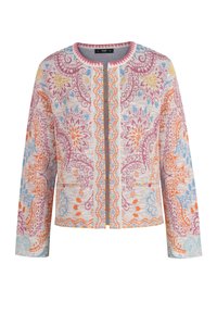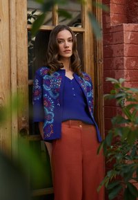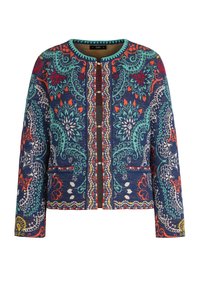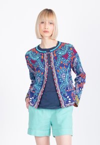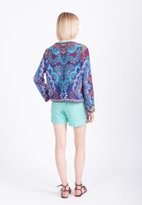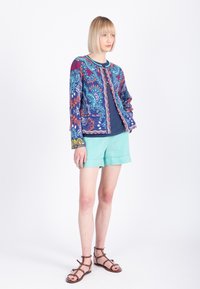 Femme blonde portant une veste colorée à motifs sur un haut bleu marine avec un short turquoise clair, debout les mains dans les poches sur fond blanc.