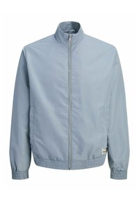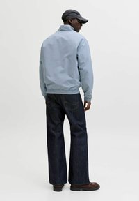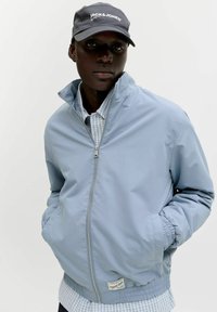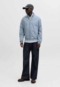 Homme portant une veste zippée bleu clair sur une chemise à carreaux, un jean foncé et une casquette gris foncé Jack & Jones, les mains dans les poches de la veste.