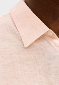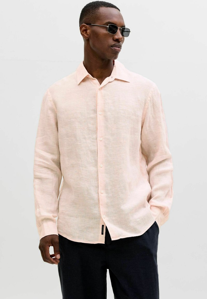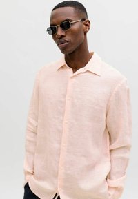 Homme portant une chemise boutonnée à manches longues de couleur rose clair, un pantalon foncé et des lunettes de soleil rectangulaires, debout avec une main dans la poche.